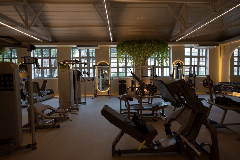 Na área de treino livre, a solução técnica também traduz essa preocupação estética. Foi adotada uma camada dupla de piso: manta de borracha para absorção de impacto e, sobre ela, um revestimento sintético claro que mimetiza o carpete. A funcionalidade está resolvida sem recorrer à estética industrial típica desses ambientes. Ao contrário, a solução adotada reforça a experiência de acolhimento e a proposta central – uma casa de bem-estar.